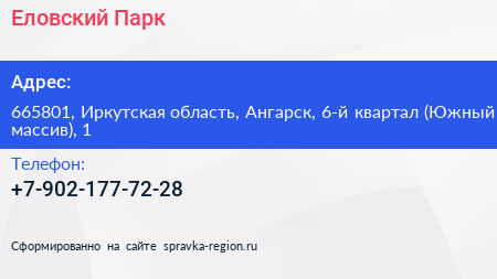 Еловский Парк по адресу 665801, Иркутская область, Ангарск, 6-й квартал (Южный массив), 1 в дальнейшем Организация, размещена в следующих категориях: