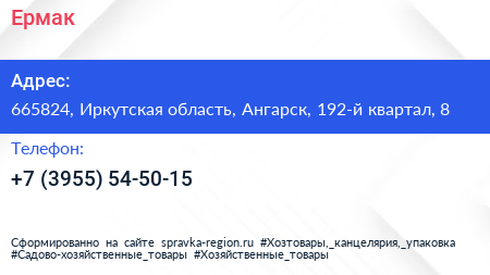 Ермак по адресу 665824, Иркутская область, Ангарск, 192-й квартал, 8 в дальнейшем Организация, размещена в следующих категориях: