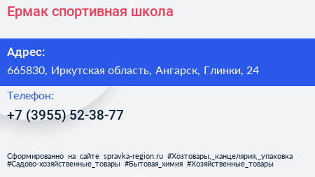 Ермак, спортивная школа по адресу 665830, Иркутская область, Ангарск, Глинки, 24 в дальнейшем Организация, размещена в следующих категориях: