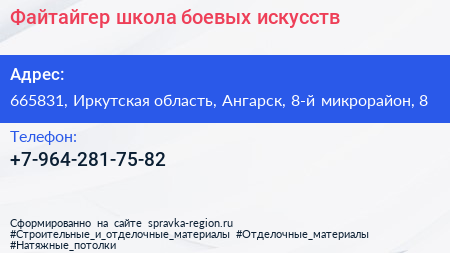 Файтайгер, школа боевых искусств по адресу 665831, Иркутская область, Ангарск, 8-й микрорайон, 8 в дальнейшем Организация, размещена в следующих категориях: