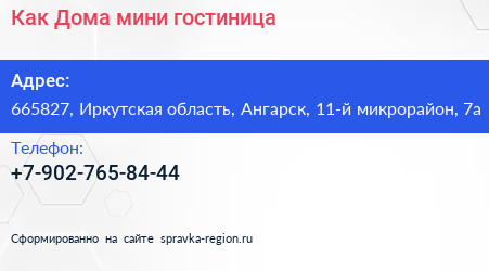 Как Дома, мини-гостиница по адресу 665827, Иркутская область, Ангарск, 11-й микрорайон, 7а в дальнейшем Организация, размещена в следующих категориях: