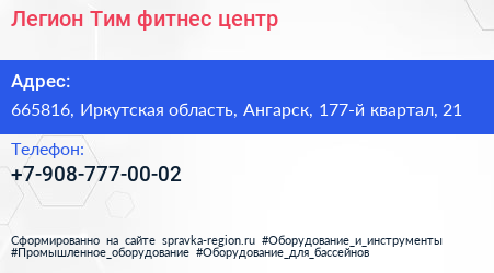 Легион Тим, фитнес-центр по адресу 665816, Иркутская область, Ангарск, 177-й квартал, 21 в дальнейшем Организация, размещена в следующих категориях: