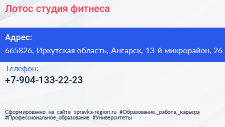 Лотос, студия фитнеса по адресу 665826, Иркутская область, Ангарск, 13-й микрорайон, 26 в дальнейшем Организация, размещена в следующих категориях:
