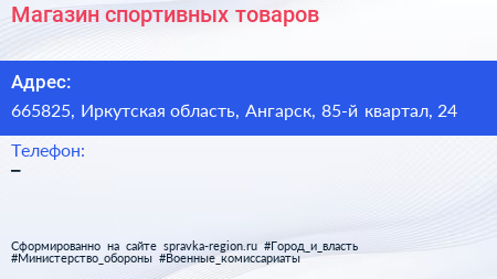 Магазин спортивных товаров по адресу 665825, Иркутская область, Ангарск, 85-й квартал, 24 в дальнейшем Организация, размещена в следующих категориях: