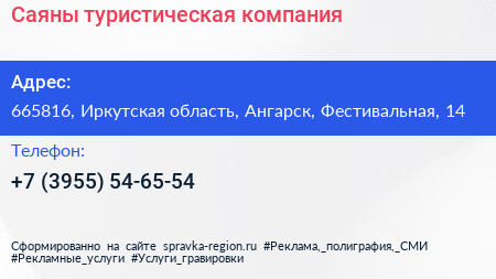 Саяны, туристическая компания по адресу 665816, Иркутская область, Ангарск, Фестивальная, 14 в дальнейшем Организация, размещена в следующих категориях: