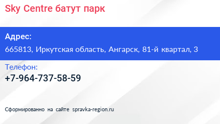 Sky Centre, батут-парк по адресу 665813, Иркутская область, Ангарск, 81-й квартал, 3 в дальнейшем Организация, размещена в следующих категориях: