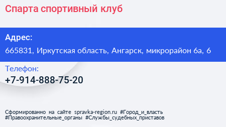 Спарта, спортивный клуб по адресу 665831, Иркутская область, Ангарск, микрорайон 6а, 6 в дальнейшем Организация, размещена в следующих категориях: