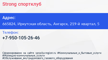 Strong, спортклуб по адресу 665824, Иркутская область, Ангарск, 219-й квартал, 5 в дальнейшем Организация, размещена в следующих категориях: