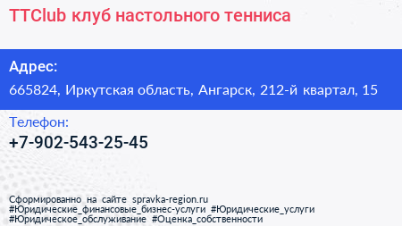 TTClub, клуб настольного тенниса по адресу 665824, Иркутская область, Ангарск, 212-й квартал, 15 в дальнейшем Организация, размещена в следующих категориях: