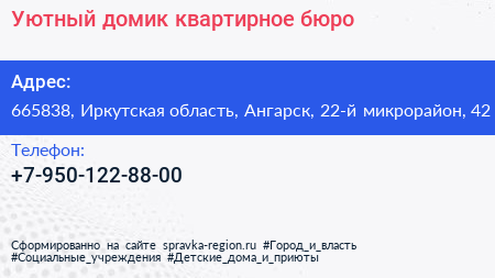 Уютный домик, квартирное бюро по адресу 665838, Иркутская область, Ангарск, 22-й микрорайон, 42 в дальнейшем Организация, размещена в следующих категориях: