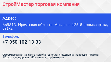 СтройМастер, торговая компания по адресу 665813, Иркутская область, Ангарск, 125-й промквартал, ст1/2 в дальнейшем Организация, размещена в следующих категориях: