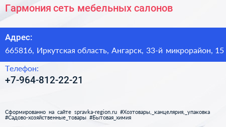 Гармония, сеть мебельных салонов по адресу 665816, Иркутская область, Ангарск, 33-й микрорайон, 15 в дальнейшем Организация, размещена в следующих категориях:
