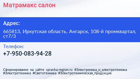 Матрамакс, салон по адресу 665813, Иркутская область, Ангарск, 108-й промквартал, ст7/3 в дальнейшем Организация, размещена в следующих категориях: