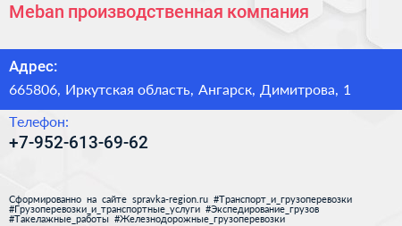 Meban, производственная компания по адресу 665806, Иркутская область, Ангарск, Димитрова, 1 в дальнейшем Организация, размещена в следующих категориях: