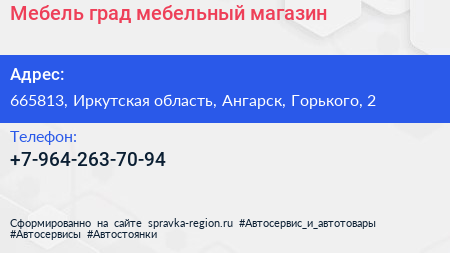 Мебель град, мебельный магазин по адресу 665813, Иркутская область, Ангарск, Горького, 2 в дальнейшем Организация, размещена в следующих категориях: