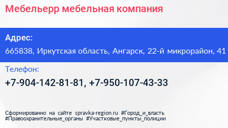 Мебельерр, мебельная компания по адресу 665838, Иркутская область, Ангарск, 22-й микрорайон, 41 в дальнейшем Организация, размещена в следующих категориях: