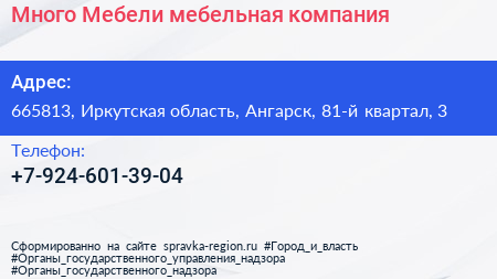 Много Мебели, мебельная компания по адресу 665813, Иркутская область, Ангарск, 81-й квартал, 3 в дальнейшем Организация, размещена в следующих категориях: