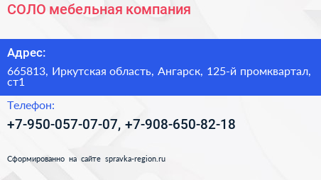 СОЛО, мебельная компания по адресу 665813, Иркутская область, Ангарск, 125-й промквартал, ст1 в дальнейшем Организация, размещена в следующих категориях: