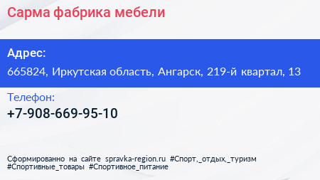 Сарма, фабрика мебели по адресу 665824, Иркутская область, Ангарск, 219-й квартал, 13 в дальнейшем Организация, размещена в следующих категориях: