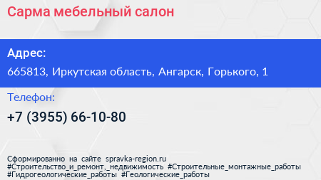 Сарма, мебельный салон по адресу 665813, Иркутская область, Ангарск, Горького, 1 в дальнейшем Организация, размещена в следующих категориях:
