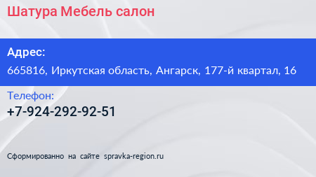 Шатура Мебель, салон по адресу 665816, Иркутская область, Ангарск, 177-й квартал, 16 в дальнейшем Организация, размещена в следующих категориях: