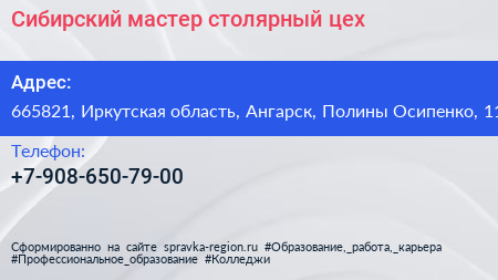 Сибирский мастер, столярный цех по адресу 665821, Иркутская область, Ангарск, Полины Осипенко, 11 в дальнейшем Организация, размещена в следующих категориях: