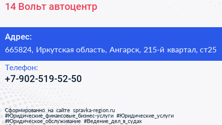 14 Вольт, автоцентр по адресу 665824, Иркутская область, Ангарск, 215-й квартал, ст25 в дальнейшем Организация, размещена в следующих категориях: