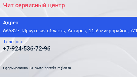 Чит, сервисный центр по адресу 665827, Иркутская область, Ангарск, 11-й микрорайон, 7/1 в дальнейшем Организация, размещена в следующих категориях: