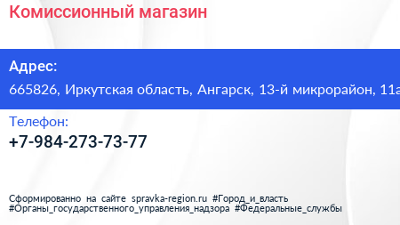 Комиссионный магазин по адресу 665826, Иркутская область, Ангарск, 13-й микрорайон, 11а в дальнейшем Организация, размещена в следующих категориях: