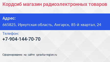 Кордсиб, магазин радиоэлектронных товаров по адресу 665825, Иркутская область, Ангарск, 85-й квартал, 24 в дальнейшем Организация, размещена в следующих категориях: