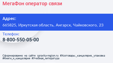 МегаФон, оператор связи по адресу 665825, Иркутская область, Ангарск, Чайковского, 23 в дальнейшем Организация, размещена в следующих категориях: