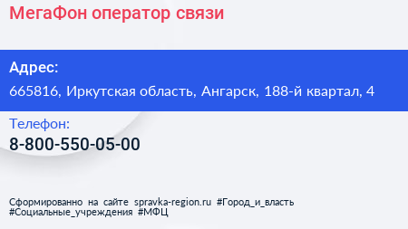 МегаФон, оператор связи по адресу 665816, Иркутская область, Ангарск, 188-й квартал, 4 в дальнейшем Организация, размещена в следующих категориях: