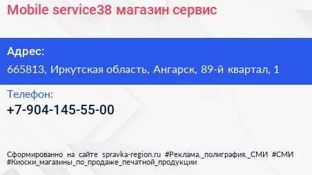 Mobile service38, магазин-сервис по адресу 665813, Иркутская область, Ангарск, 89-й квартал, 1 в дальнейшем Организация, размещена в следующих категориях: