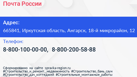 Почта России по адресу 665841, Иркутская область, Ангарск, 18-й микрорайон, 12 в дальнейшем Организация, размещена в следующих категориях: