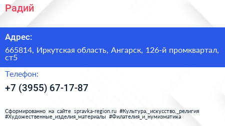 Радий по адресу 665814, Иркутская область, Ангарск, 126-й промквартал, ст5 в дальнейшем Организация, размещена в следующих категориях: