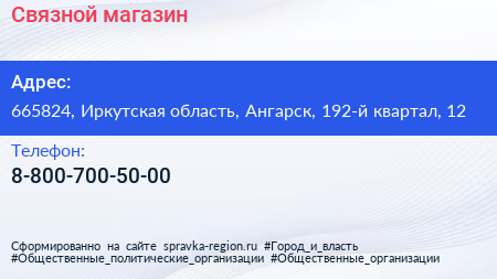 Связной, магазин по адресу 665824, Иркутская область, Ангарск, 192-й квартал, 12 в дальнейшем Организация, размещена в следующих категориях: