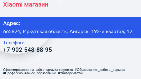Xiaomi, магазин по адресу 665824, Иркутская область, Ангарск, 192-й квартал, 12 в дальнейшем Организация, размещена в следующих категориях: