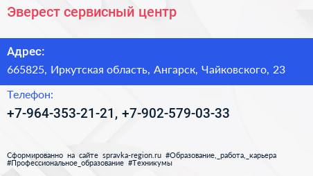 Эверест, сервисный центр по адресу 665825, Иркутская область, Ангарск, Чайковского, 23 в дальнейшем Организация, размещена в следующих категориях: