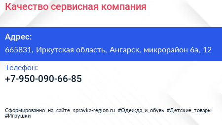 Качество, сервисная компания по адресу 665831, Иркутская область, Ангарск, микрорайон 6а, 12 в дальнейшем Организация, размещена в следующих категориях: