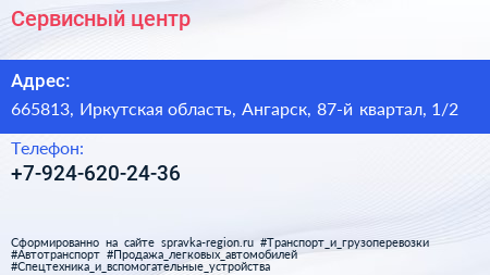 Сервисный центр по адресу 665813, Иркутская область, Ангарск, 87-й квартал, 1/2 в дальнейшем Организация, размещена в следующих категориях: