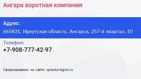 Ангара, воротная компания по адресу 665831, Иркутская область, Ангарск, 257-й квартал, 10 в дальнейшем Организация, размещена в следующих категориях: