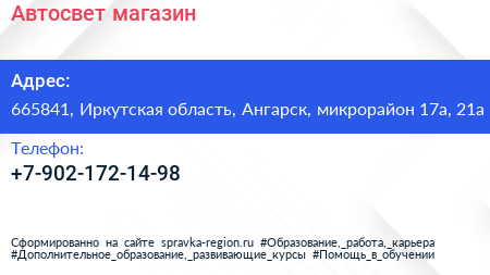 Автосвет, магазин по адресу 665841, Иркутская область, Ангарск, микрорайон 17а, 21а в дальнейшем Организация, размещена в следующих категориях: