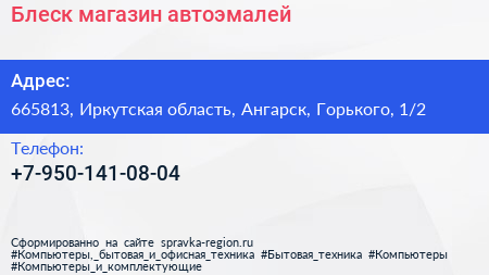 Блеск, магазин автоэмалей по адресу 665813, Иркутская область, Ангарск, Горького, 1/2 в дальнейшем Организация, размещена в следующих категориях: