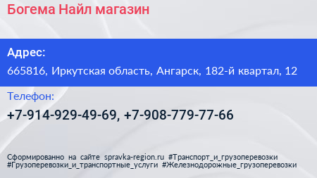 Богема Найл, магазин по адресу 665816, Иркутская область, Ангарск, 182-й квартал, 12 в дальнейшем Организация, размещена в следующих категориях: