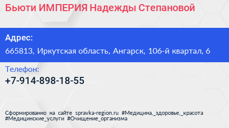 Бьюти ИМПЕРИЯ Надежды Степановой по адресу 665813, Иркутская область, Ангарск, 106-й квартал, 6 в дальнейшем Организация, размещена в следующих категориях: