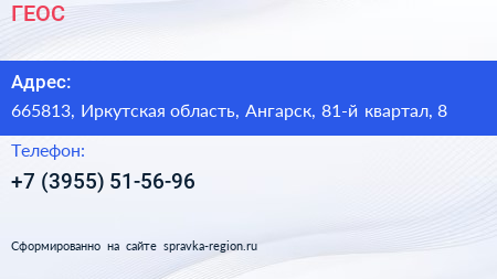 ГЕОС по адресу 665813, Иркутская область, Ангарск, 81-й квартал, 8 в дальнейшем Организация, размещена в следующих категориях:
