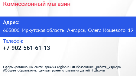 Комиссионный магазин по адресу 665806, Иркутская область, Ангарск, Олега Кошевого, 19 в дальнейшем Организация, размещена в следующих категориях: