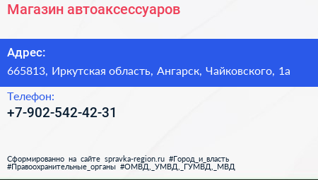 Магазин автоаксессуаров по адресу 665813, Иркутская область, Ангарск, Чайковского, 1а в дальнейшем Организация, размещена в следующих категориях: