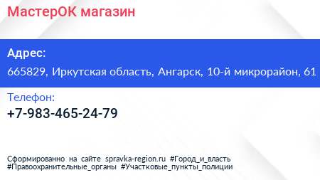 МастерОК, магазин по адресу 665829, Иркутская область, Ангарск, 10-й микрорайон, 61 в дальнейшем Организация, размещена в следующих категориях: