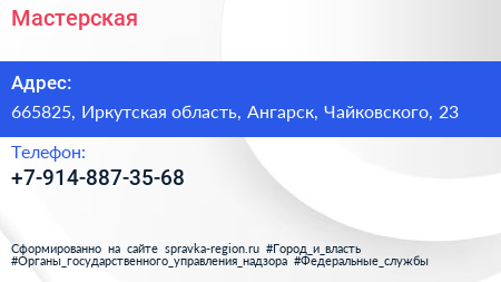 Мастерская по адресу 665825, Иркутская область, Ангарск, Чайковского, 23 в дальнейшем Организация, размещена в следующих категориях:
